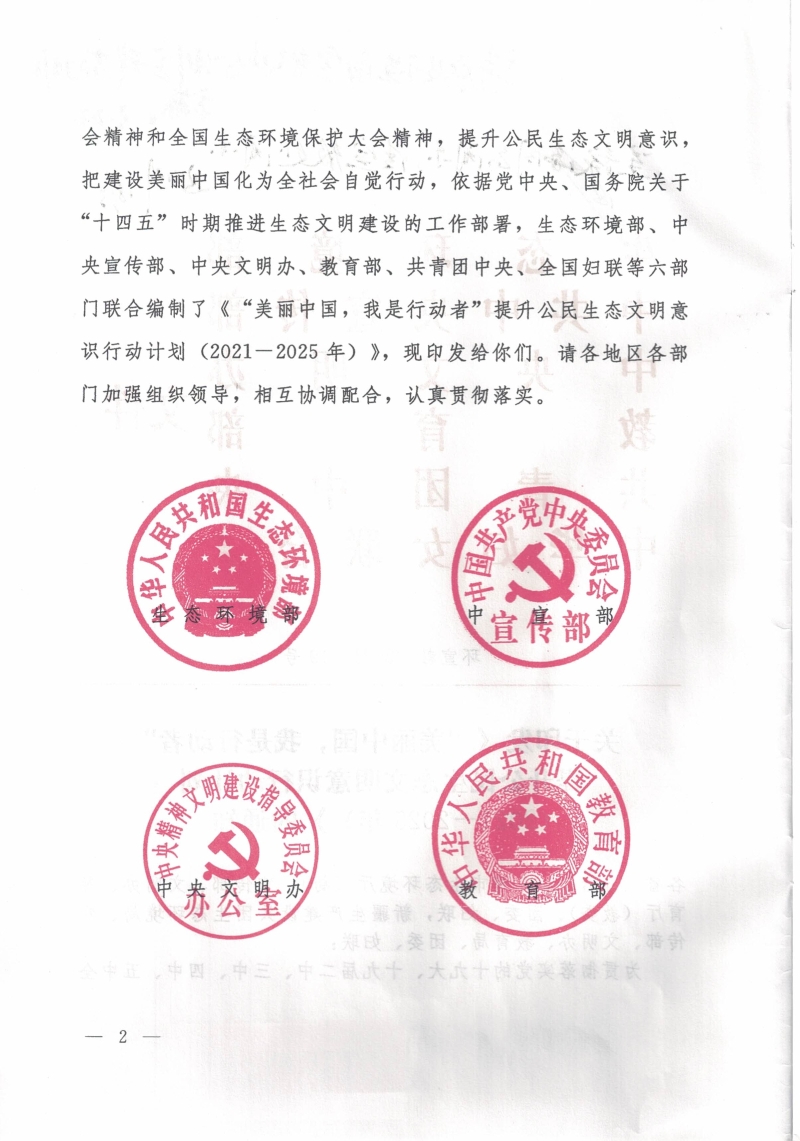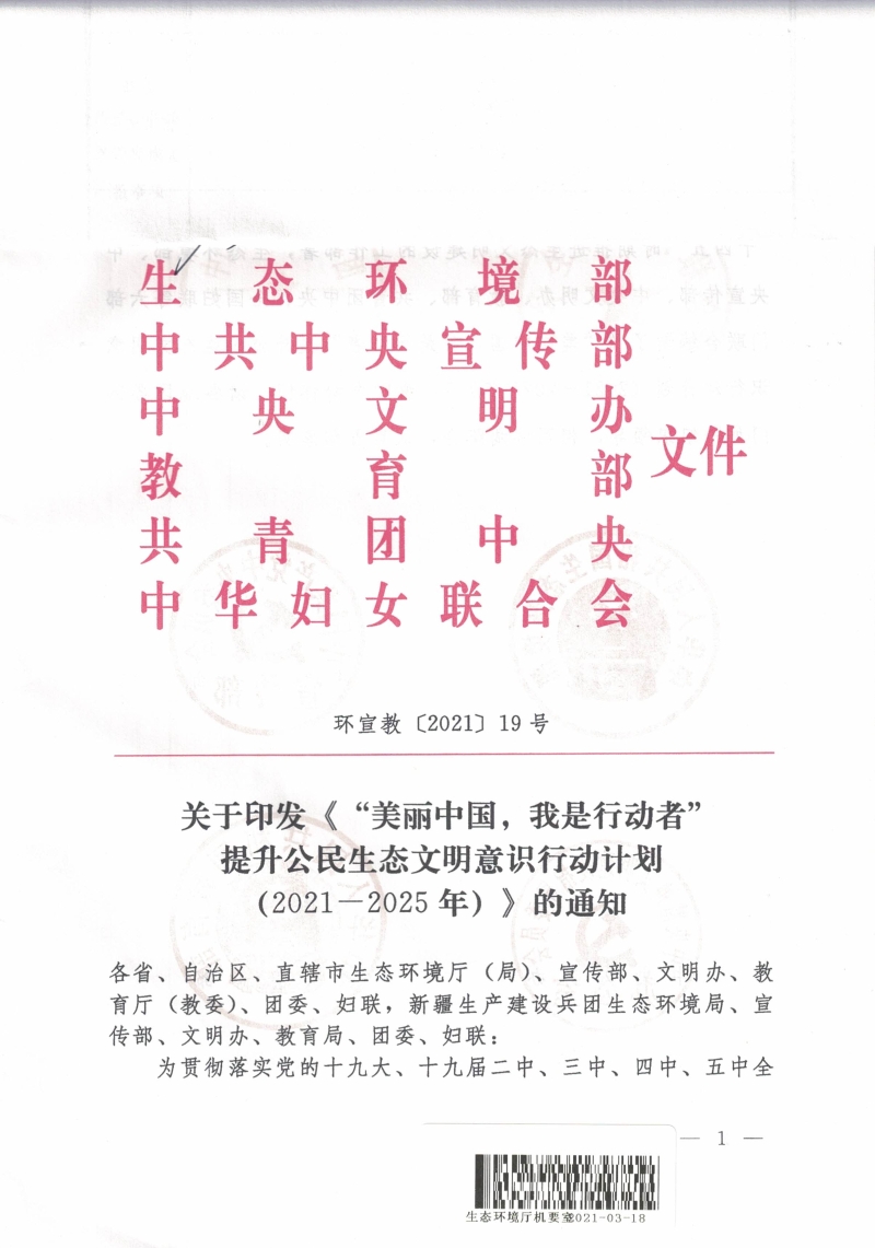 关于印发《“美丽中国,我是行动者”提升公民生态文明意识行动计划(2021-2025年)》的通知