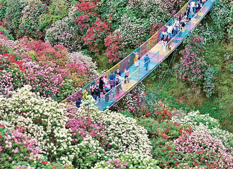 发展绿色生产力,坚持绿水青山就是金山银山理念,推动经济社会发展全面绿色转型,是满足人民日益增长的优美生态环境需要的必然要求。图为2024年4月4日,游客在贵州省毕节市百里杜鹃景区踏青赏花(无人机照片)。新华社发 李华/摄