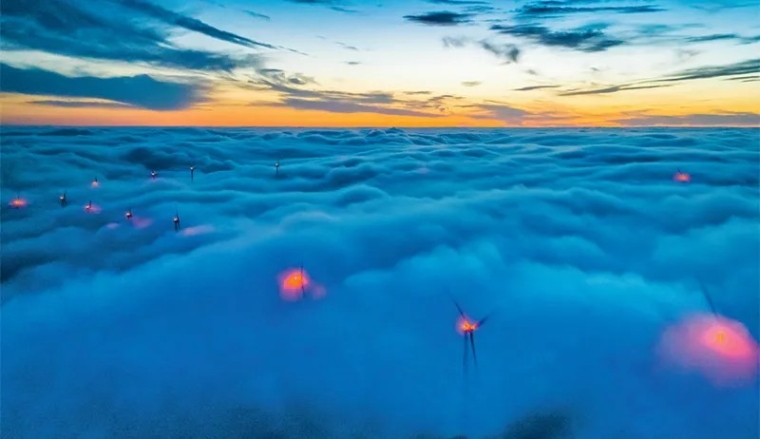 近年来,各地立足资源禀赋,加快清洁能源开发利用,推动发展方式绿色低碳转型。图为2023年2月23日晚,在湖北省宜昌市秭归县两河口镇云台荒村拍摄的风力发电机组(无人机照片)。新华社发 郑家裕/摄