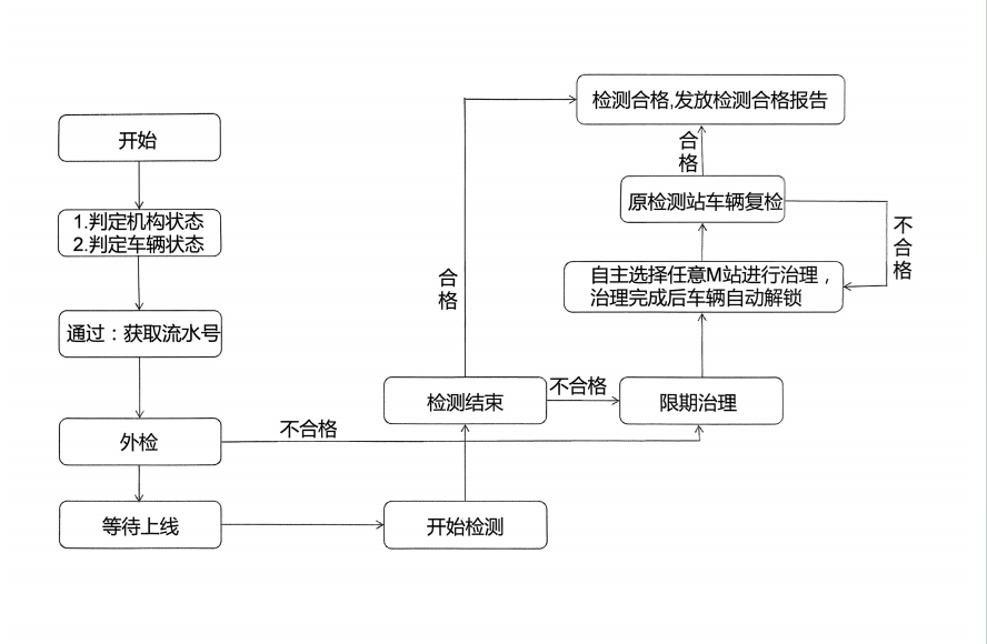 7.车主前往维修企业(M站)进行维修治理,维修企业(M站)在治理作业完成后上传维修记录、维修结算单等信息,并将维护(维修)信息推送给I/M制度信息化监管平台,治理完成后将会自动解锁,解锁后返回原检测机构进行复检。复检合格后出具检验合格报告,复检不合格返回维修企业(M站)进行再次维修治理。