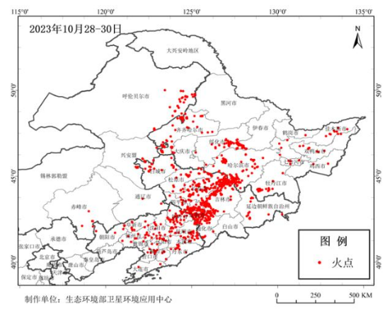 图为 10月28—30日东北地区秸秆焚烧火点分布图