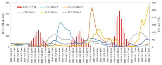 图为10月28日0时—31日8时,哈尔滨及周边城市PM2.5浓度以及东北40城市秸秆焚烧小时火点个数变化情况。