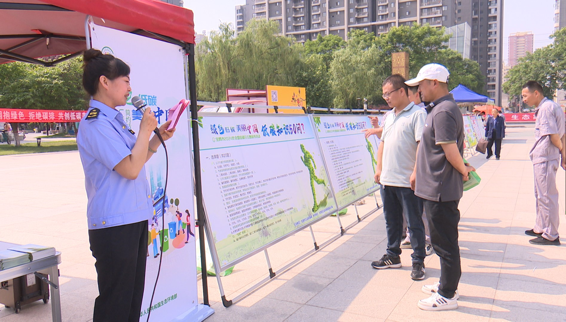 活动现场设置科普知识宣传展板,工作人员向群众普及环境气候变化知识,宣传应对气候变化、碳达峰、碳中和知识,吸引了许多群众驻足听讲。