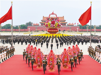 庄严的天安门广场上,鲜艳的五星红旗高高飘扬。广场中央,“祝福祖国”巨型花篮表达着对国家繁荣昌盛的美好祝愿,花篮上“欢度国庆”的字样分外醒目。人民英雄纪念碑巍然耸立,北侧两组花坛上镶嵌着白菊、康乃馨等鲜花组成的18个花环,寄托着全体中华儿女对英烈的深情追思。