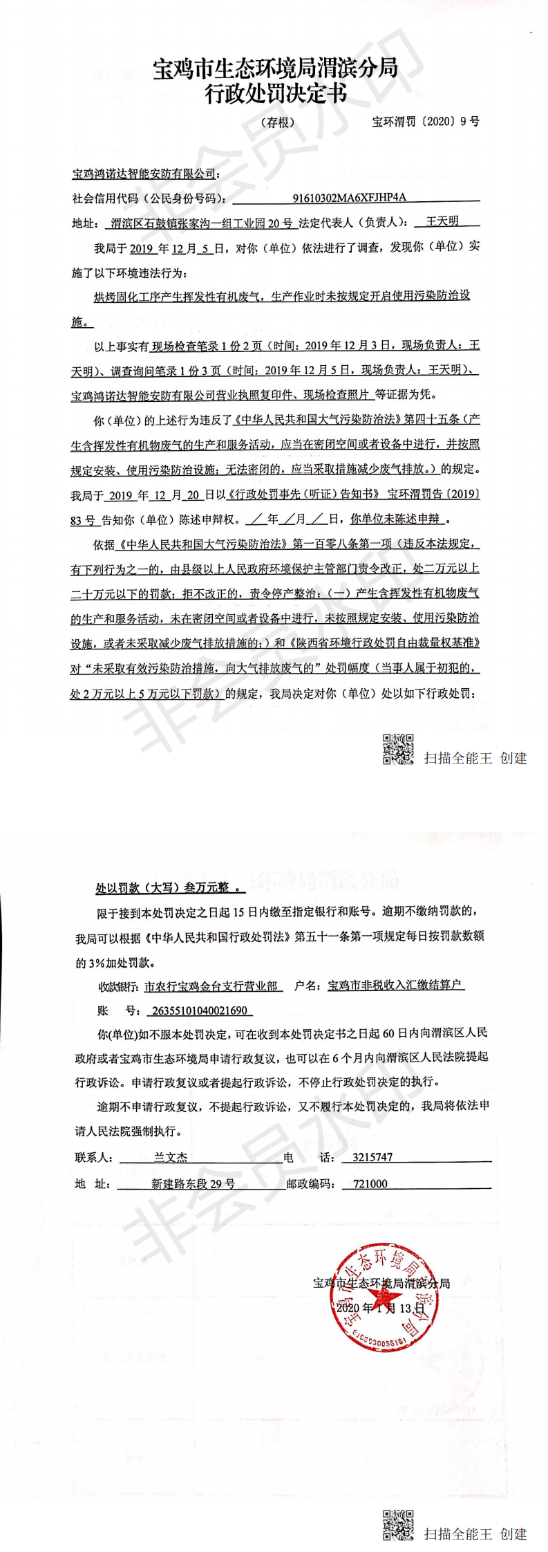 网赌平台渭滨分局行政处罚决定书(宝环渭罚〔2020〕9号)