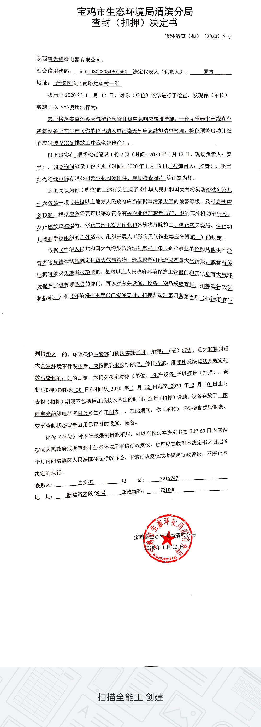 十大网赌平台排行榜渭滨分局查封(扣押)决定书(宝环渭查(扣)〔2020〕5号)
