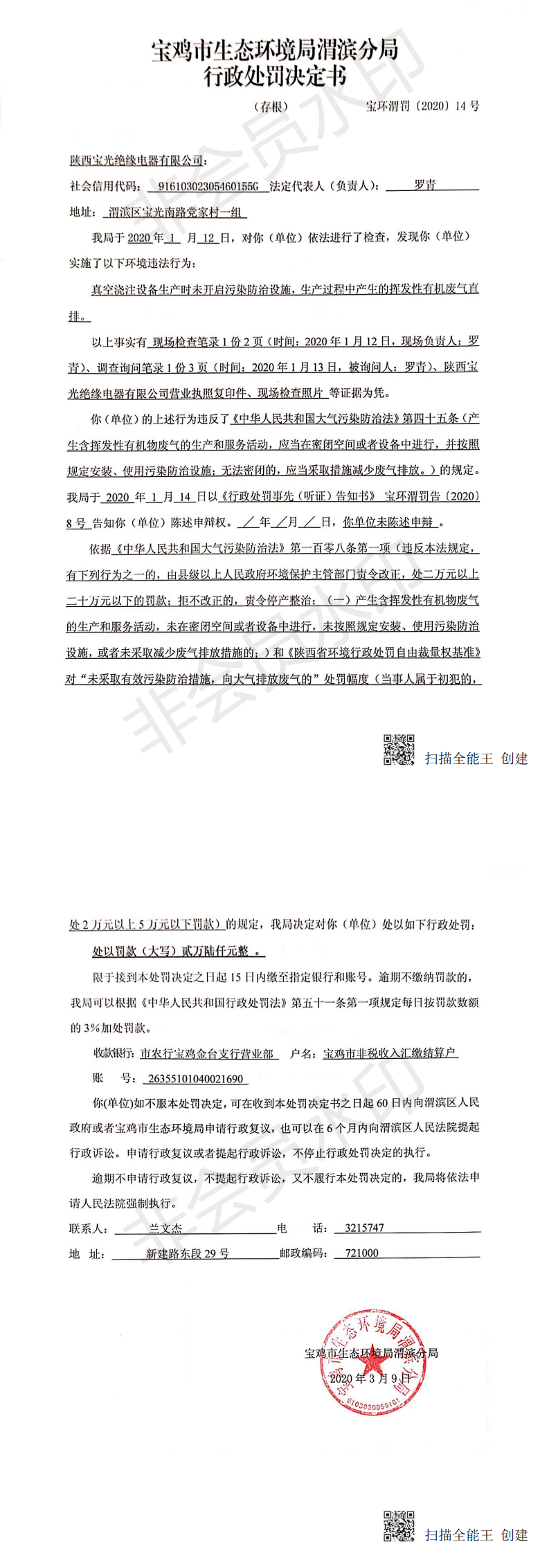 十大网赌平台排行榜渭滨分局行政处罚决定书(宝环渭罚〔2020〕14号)