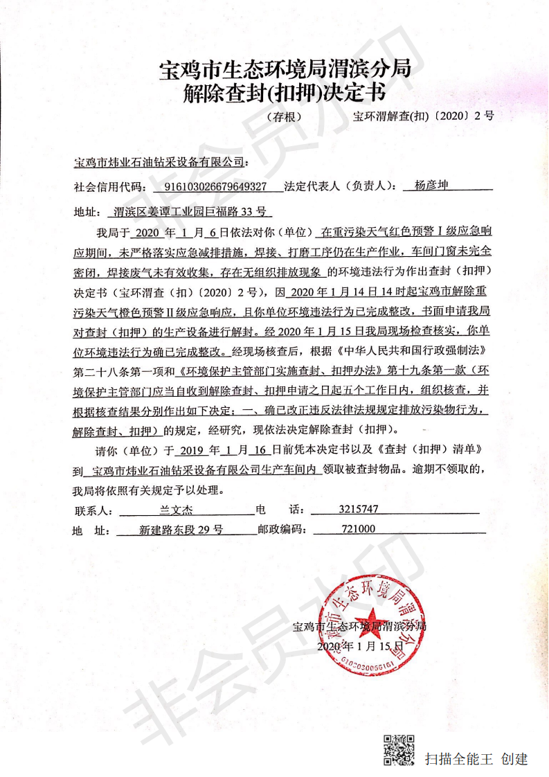 网赌平台渭滨分局解除查封(扣押)决定书(宝环渭解查(扣)〔2020〕2号)