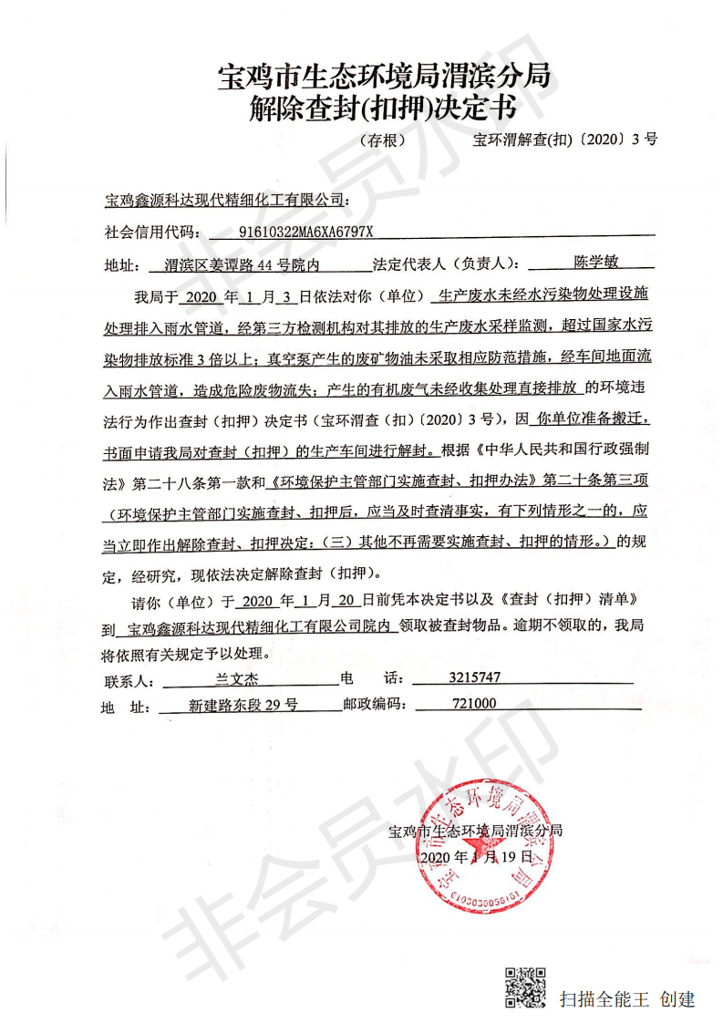 网赌平台渭滨分局解除查封(扣押)决定书(宝环渭解查(扣)〔2020〕3号)