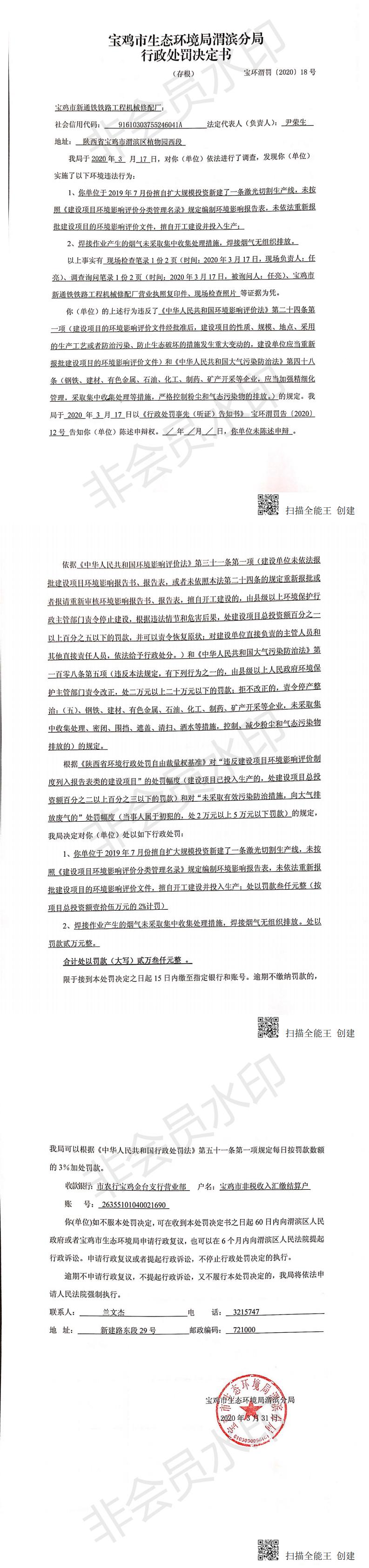 网赌平台渭滨分局行政处罚决定书(宝环渭罚〔2020〕18号)
