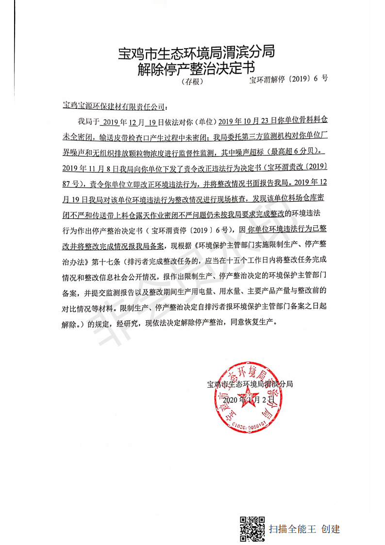 网赌平台渭滨分局解除停产整治决定书(宝环渭解停〔2019〕6号)
