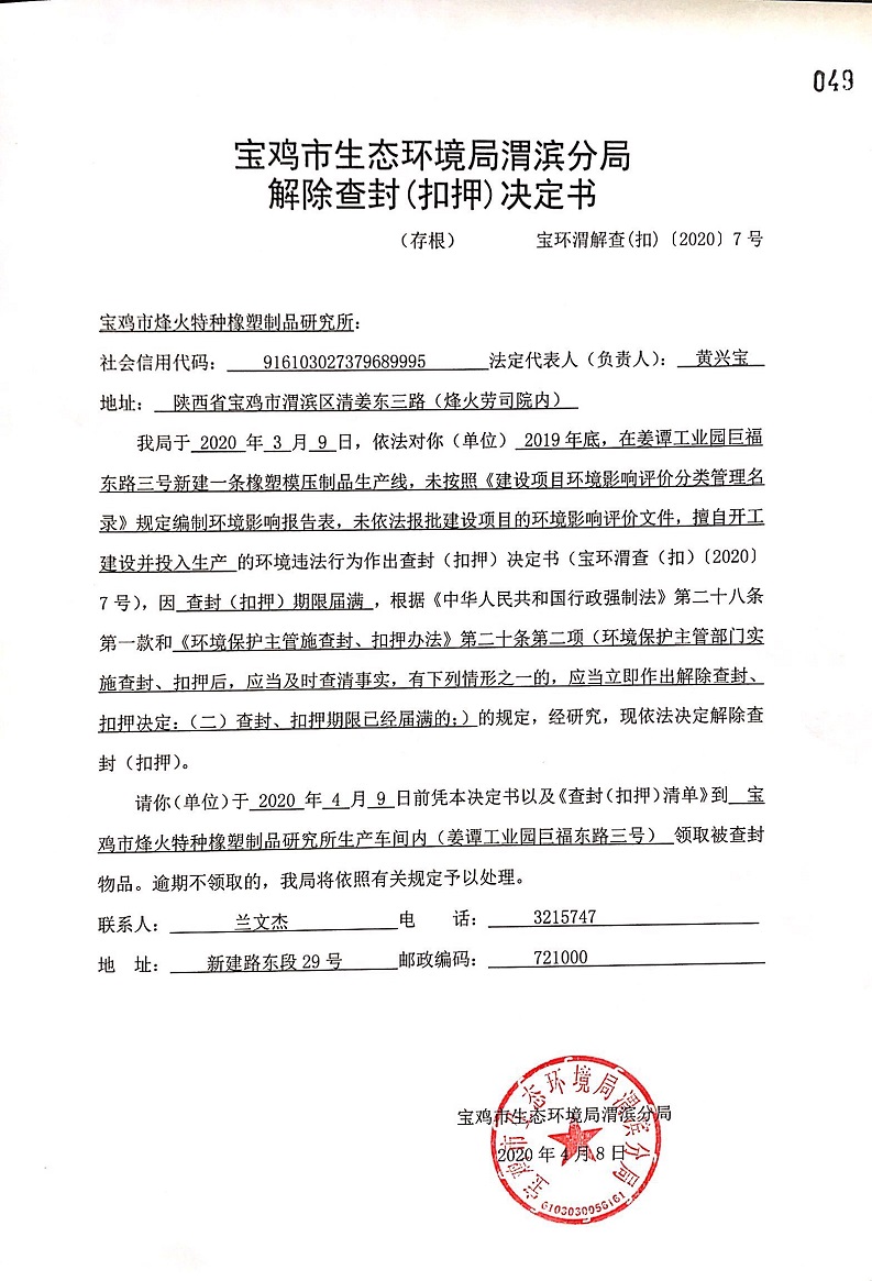 网赌平台渭滨分局解除查封(扣押)决定书(宝环渭解查(扣)〔2020〕7号)