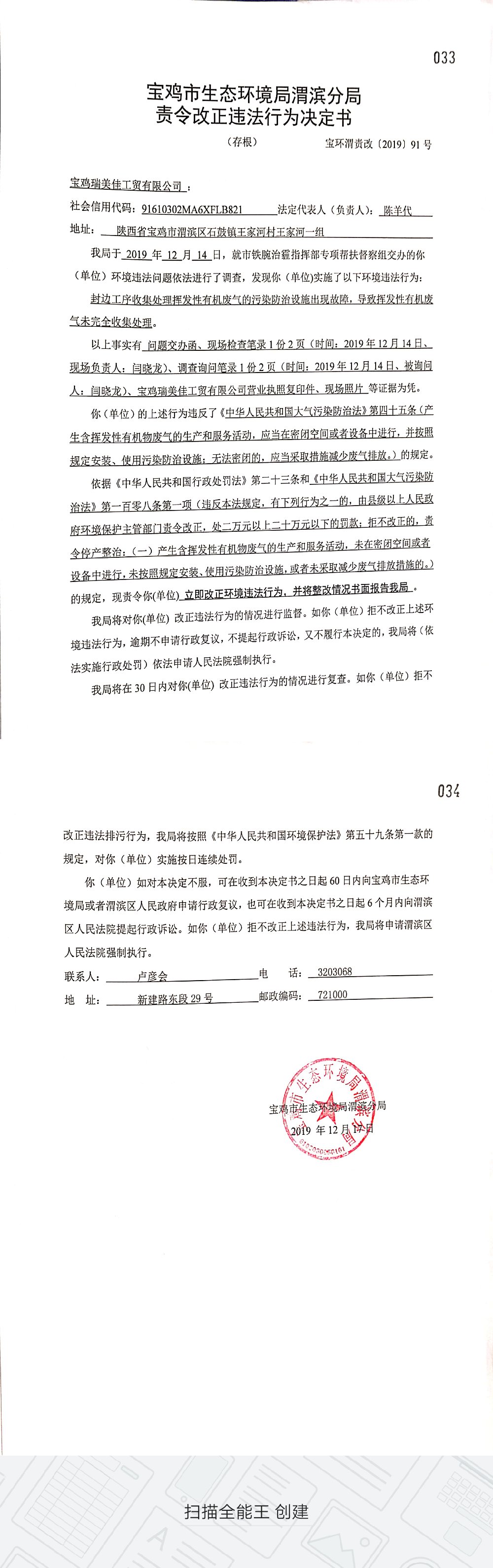 网赌平台渭滨分局责令改正违法行为决定书(宝环渭责改〔2019〕91号)