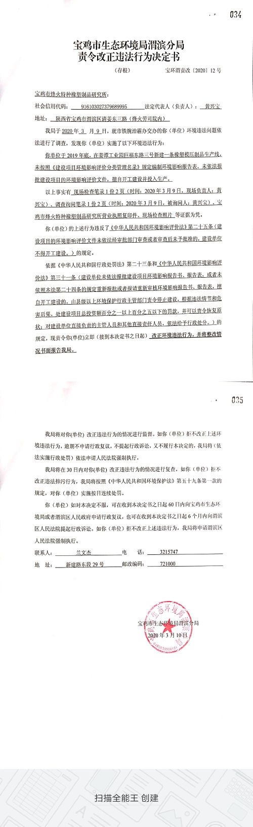网赌平台渭滨分局责令改正违法行为决定书(宝环渭责改〔2020〕12号)