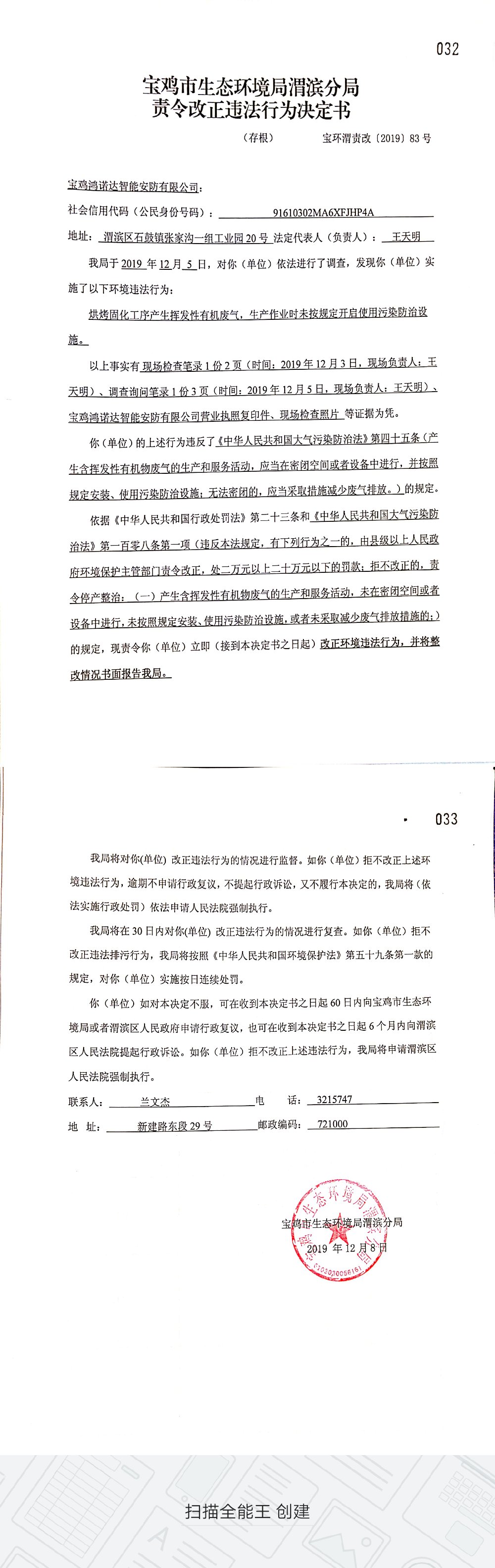 十大网赌平台排行榜渭滨分局责令改正违法行为决定书(宝环渭责改〔2019〕83号)