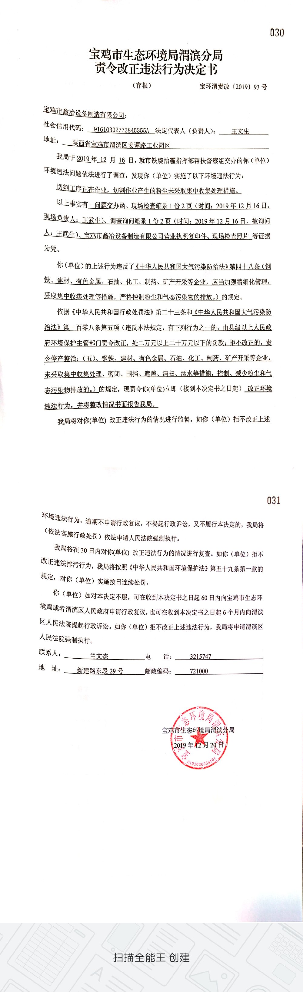网赌平台渭滨分局责令改正违法行为决定书(宝环渭责改〔2019〕93号)