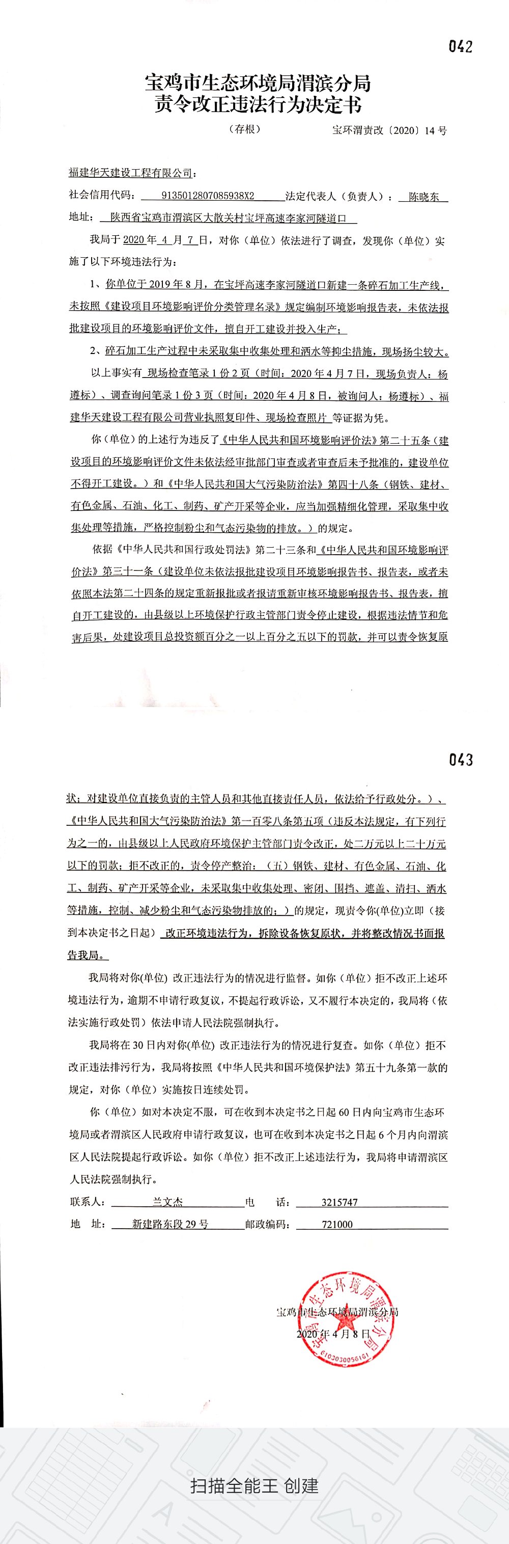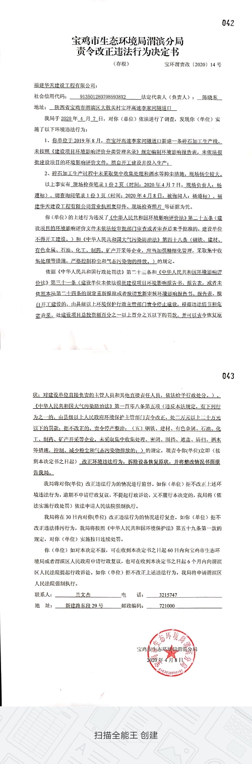 十大网赌平台排行榜渭滨分局责令改正违法行为决定书(宝环渭责改〔2020〕14号)