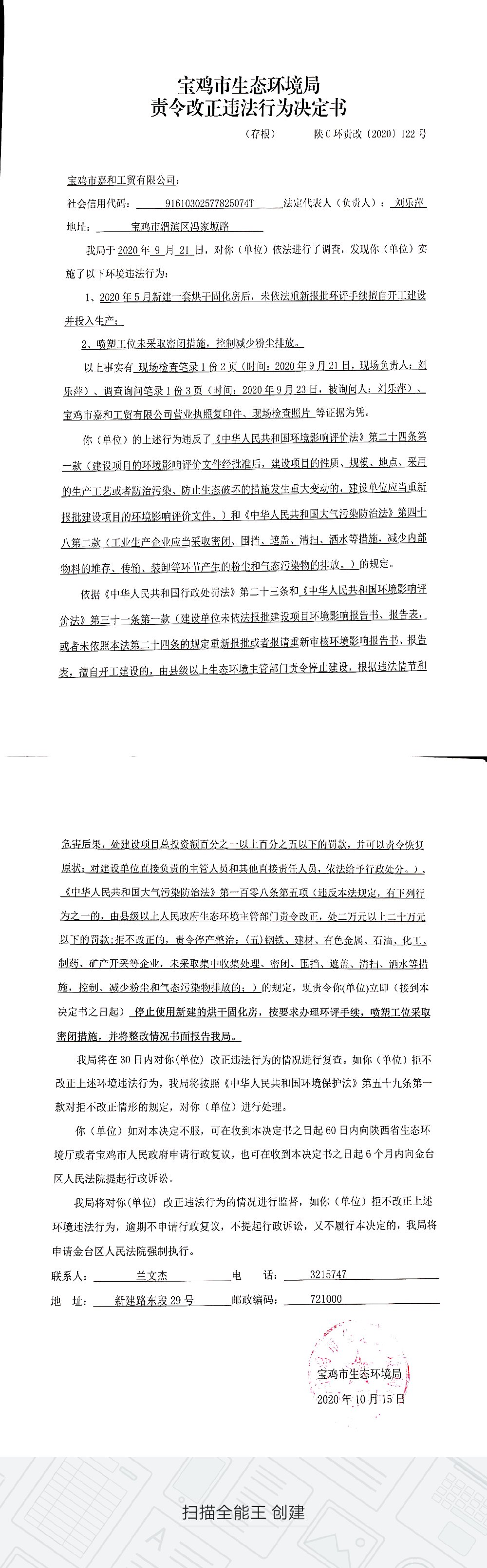 十大网赌平台排行榜责令改正违法行为决定书(陕C环责改〔2020〕122号)