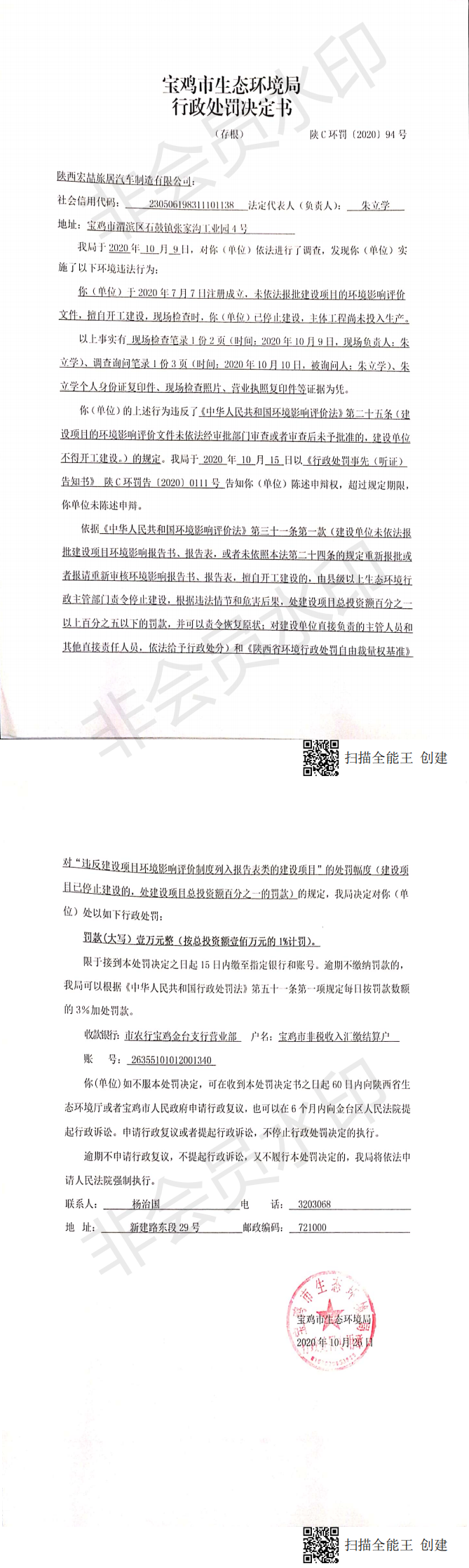 网赌平台行政处罚决定书(陕C环罚〔2020〕94号)