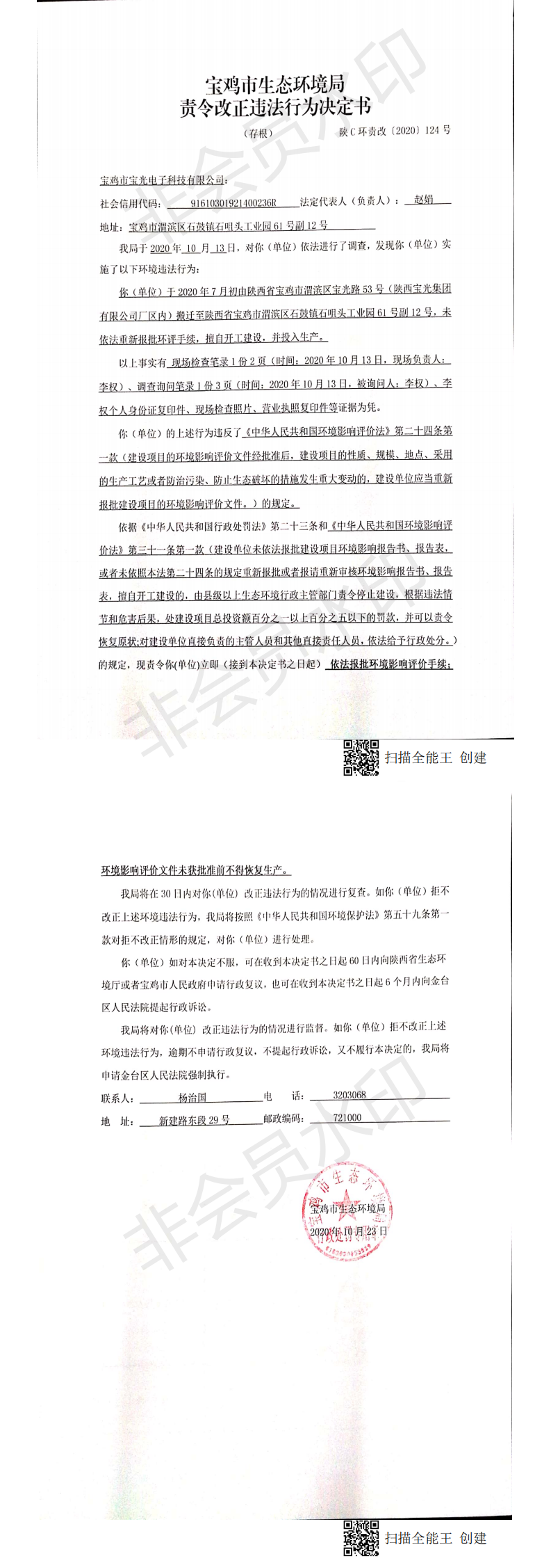 十大网赌平台排行榜责令改正违法行为决定书(陕C环责改〔2020〕124号)