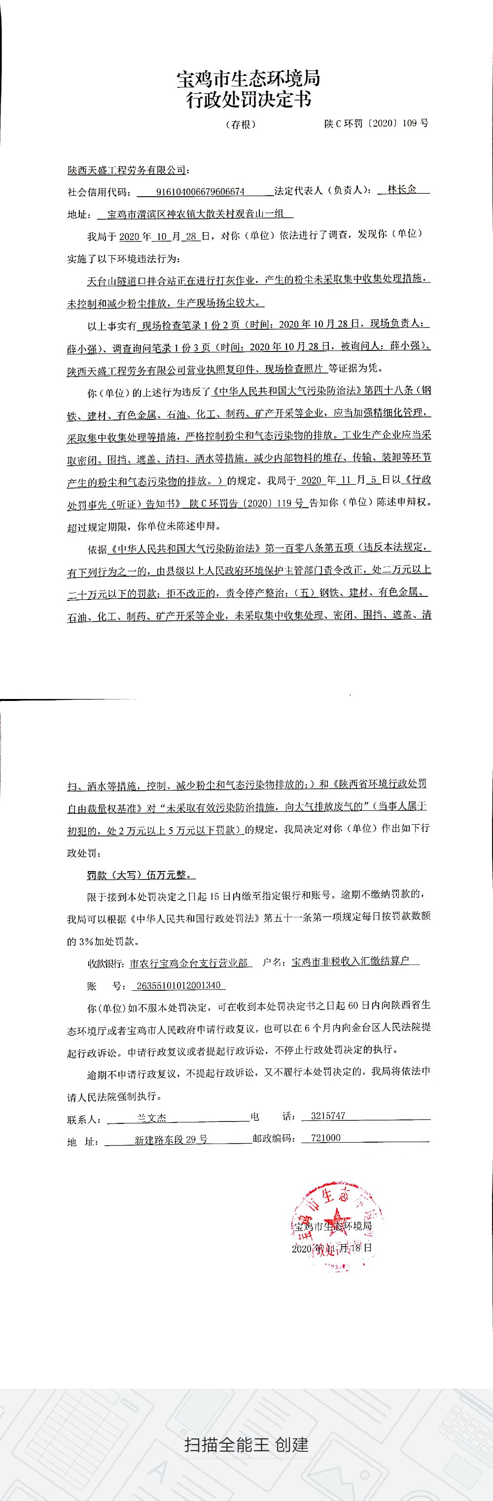 网赌平台行政处罚决定书(陕C环罚〔2020〕109号)