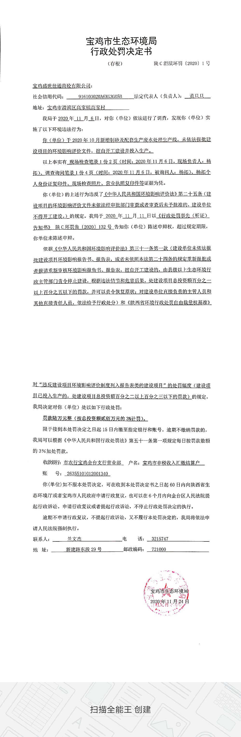 十大网赌平台排行榜行政处罚决定书(陕C渭滨环罚〔2020〕1号)