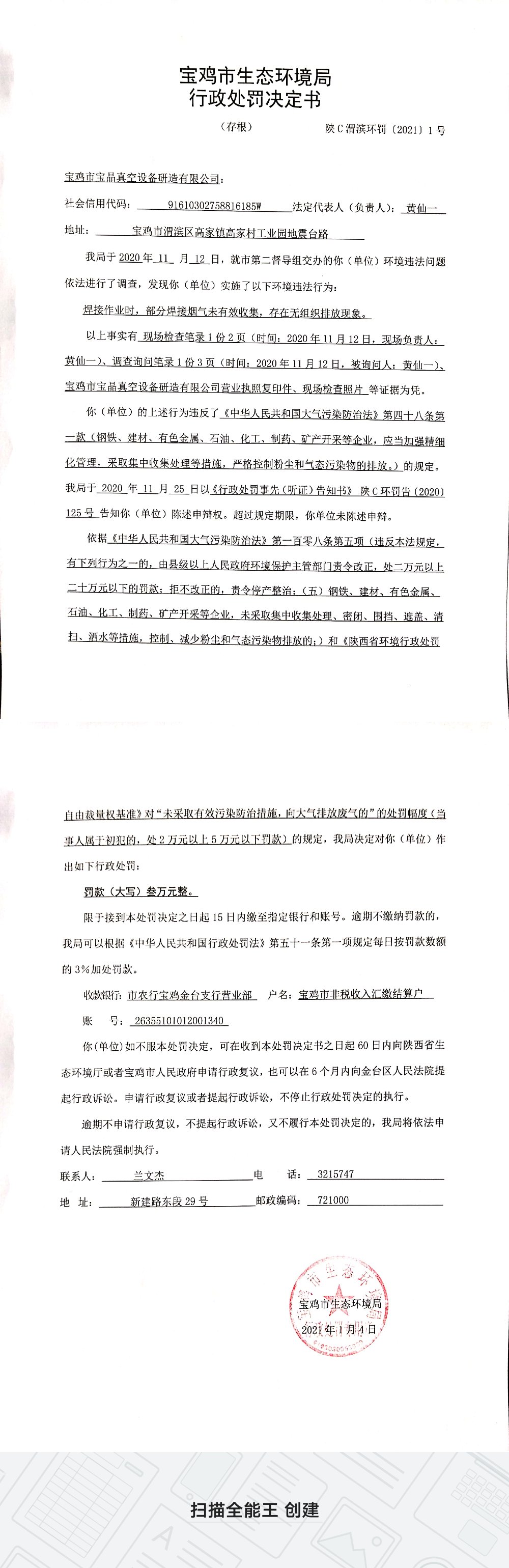 十大网赌平台排行榜行政处罚决定书(陕C渭滨环罚〔2021〕1号)
