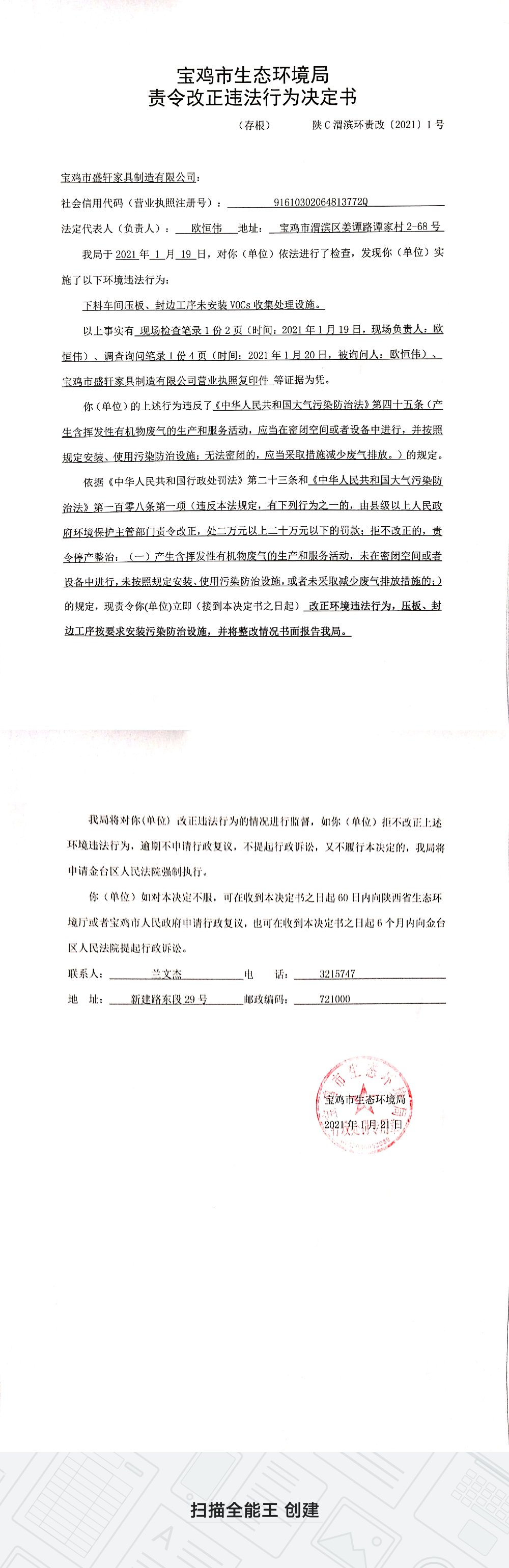 十大网赌平台排行榜责令改正违法行为决定书(陕C渭滨环责改〔2021〕1号)