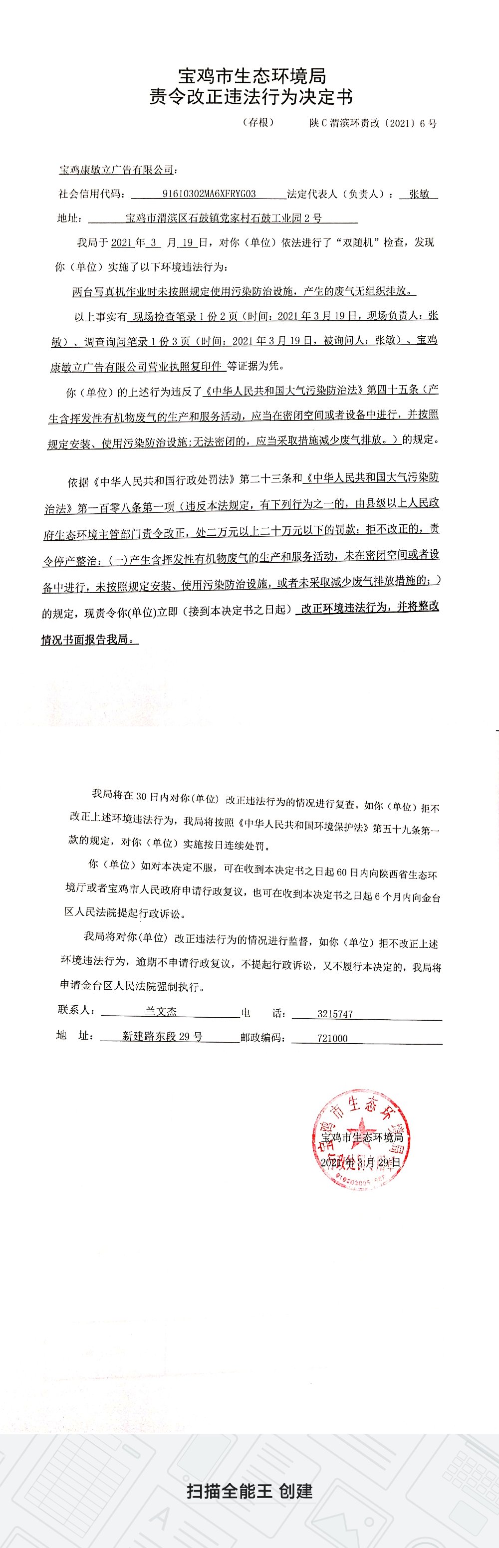 网赌平台责令改正违法行为决定书(陕C渭滨环责改〔2021〕6号)