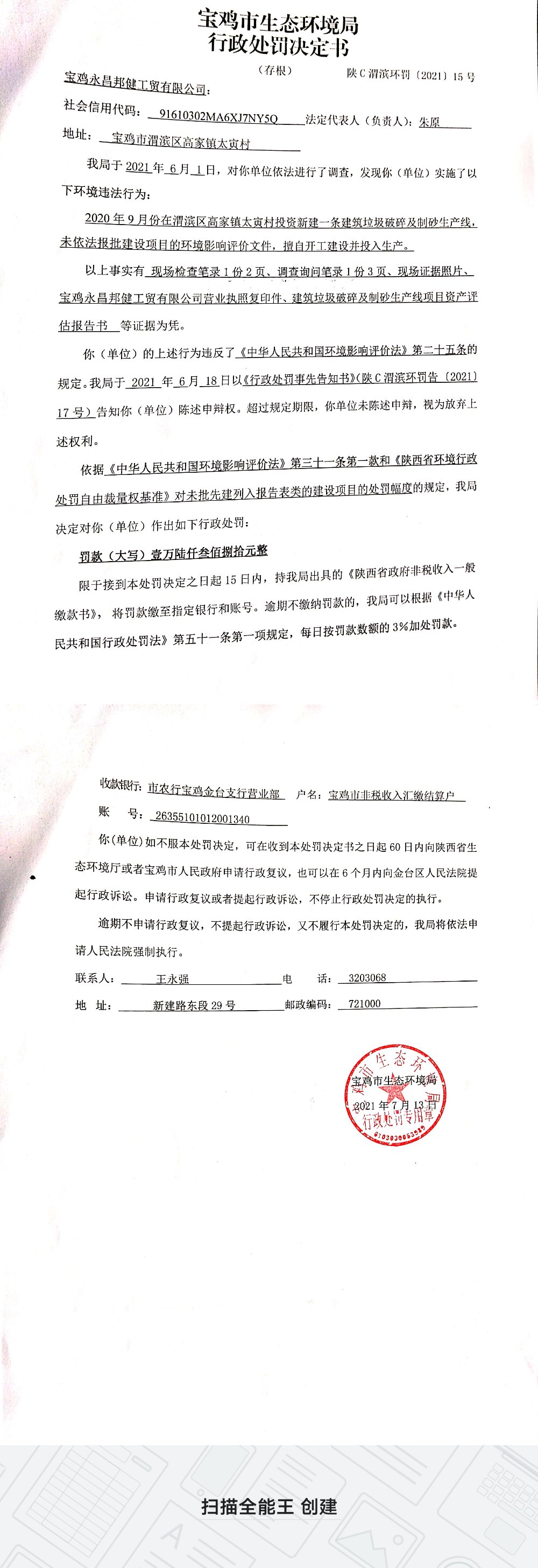 宝鸡永昌邦健工贸有限公司行政处罚决定书(陕C渭滨环罚〔2021〕15号)