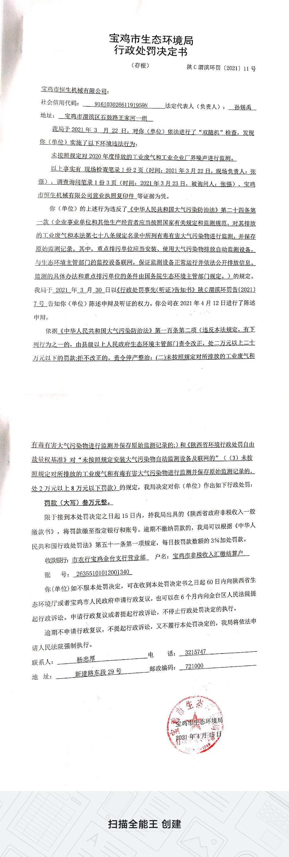 十大网赌平台排行榜行政处罚决定书(陕C渭滨环罚〔2021〕11号)