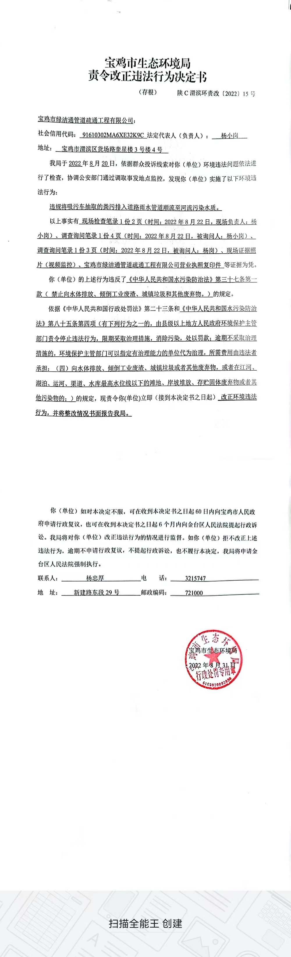 十大网赌平台排行榜责令改正违法行为决定书(陕C渭滨环责改〔2022〕15号)