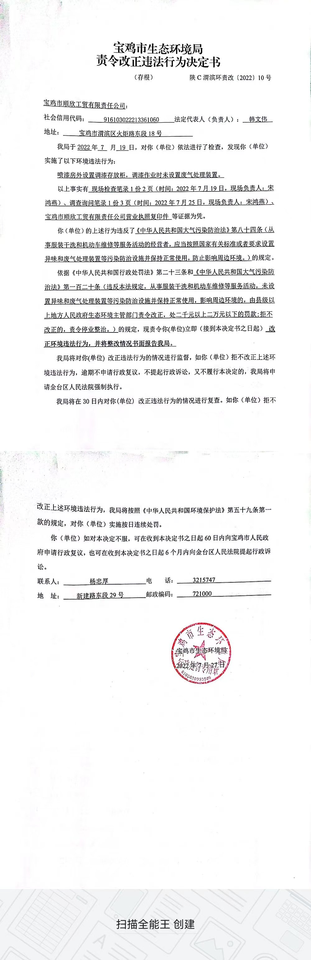 十大网赌平台排行榜责令改正违法行为决定书(陕C渭滨环责改〔2022〕10号)