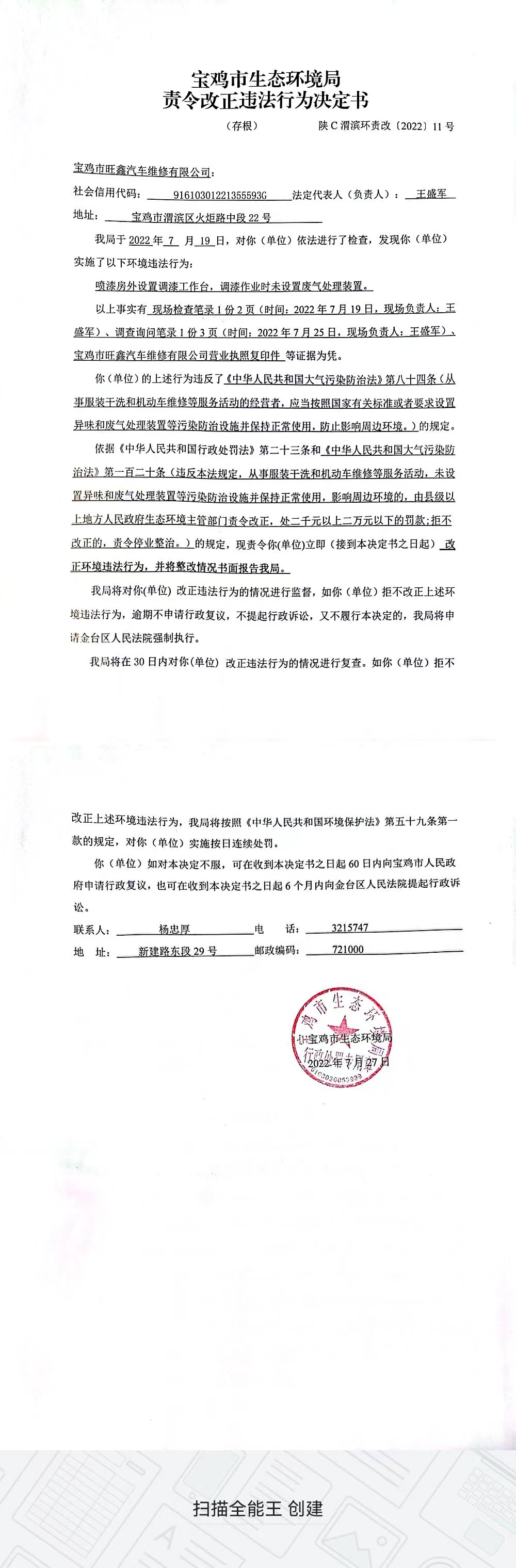 十大网赌平台排行榜责令改正违法行为决定书(陕C渭滨环责改〔2022〕11号)