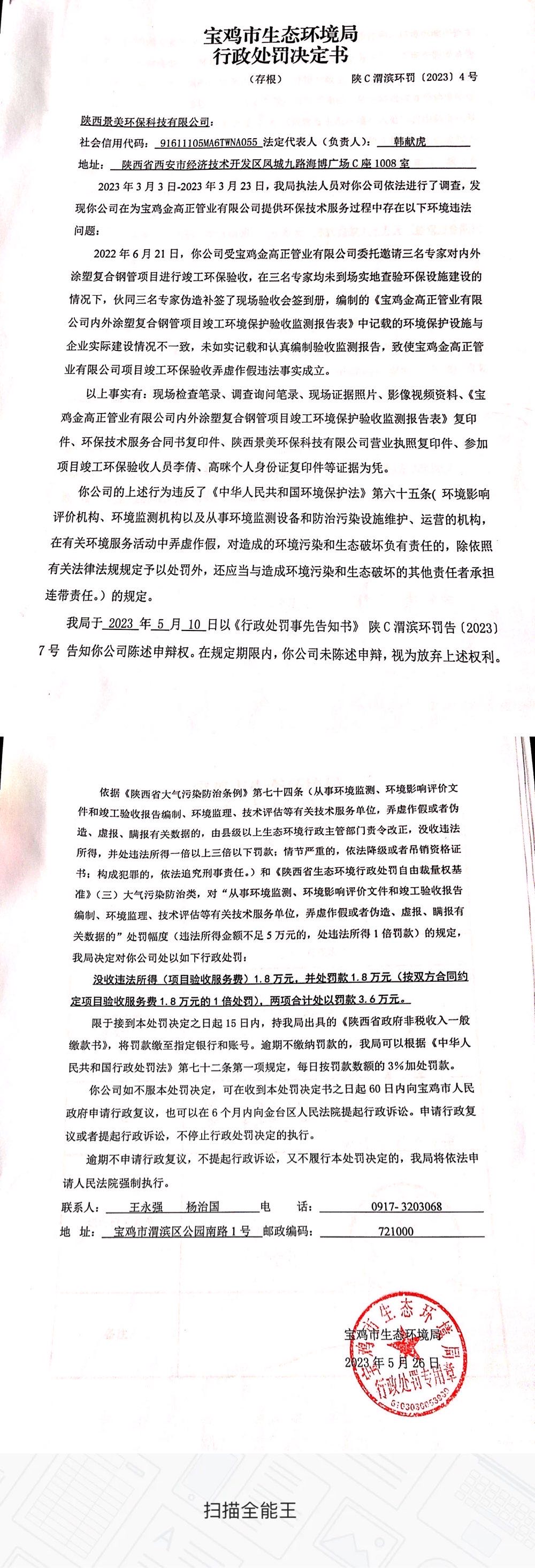 十大网赌平台排行榜行政处罚决定书(陕C渭滨环罚〔2023〕4号)