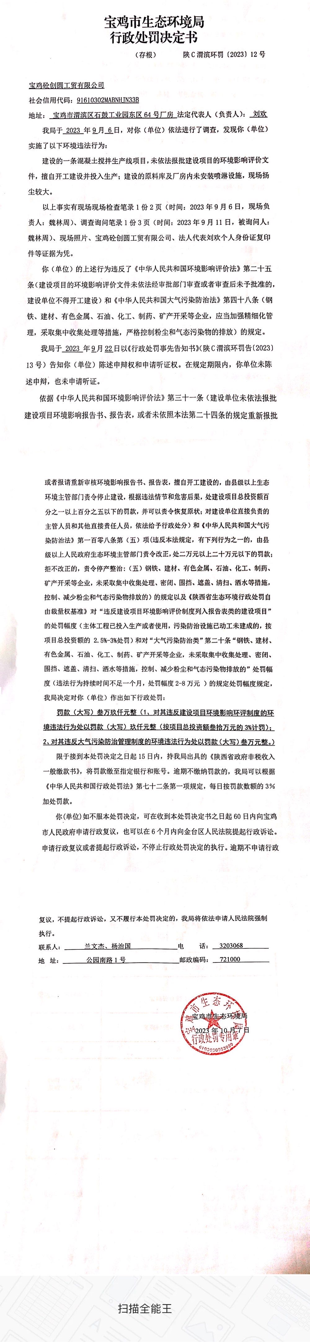 网赌平台行政处罚决定书(陕C渭滨环罚〔2023〕12号)