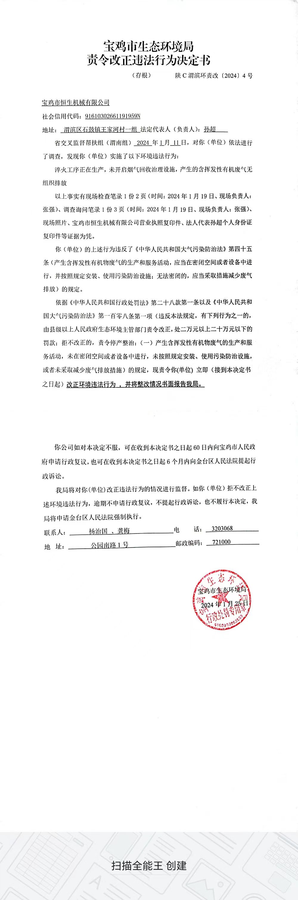 网赌平台责令改正违法行为决定书(陕C渭滨环责改〔2024〕4号)