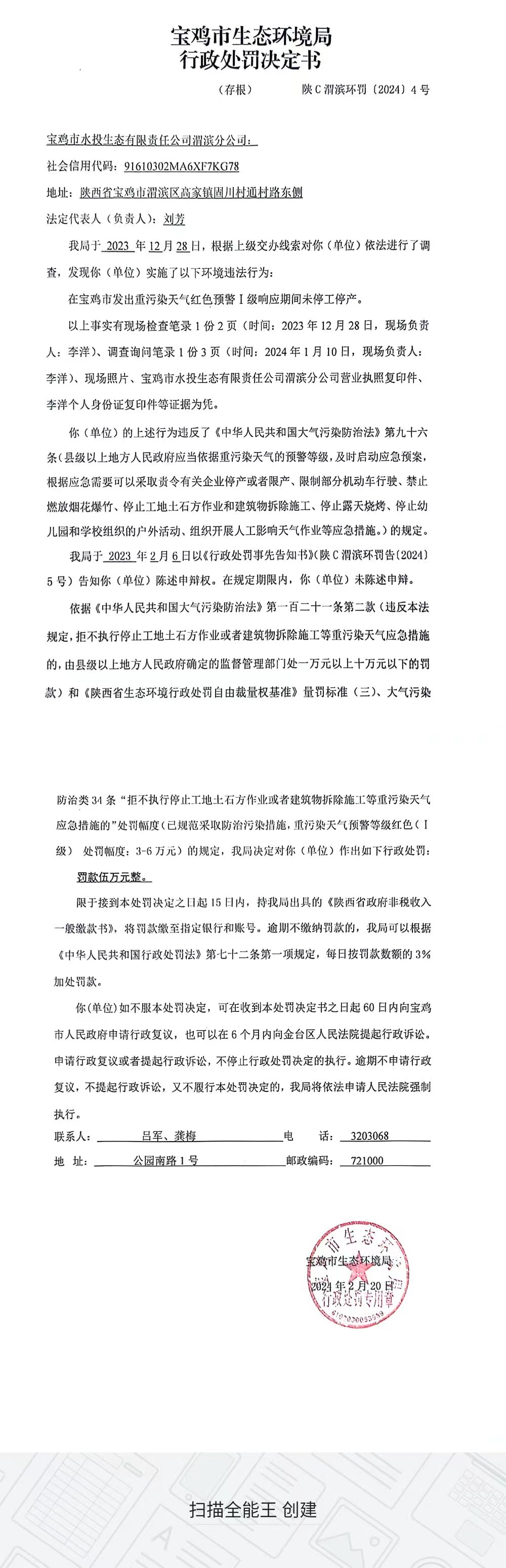 十大网赌平台排行榜行政处罚决定书(陕C渭滨环罚〔2024〕4号)