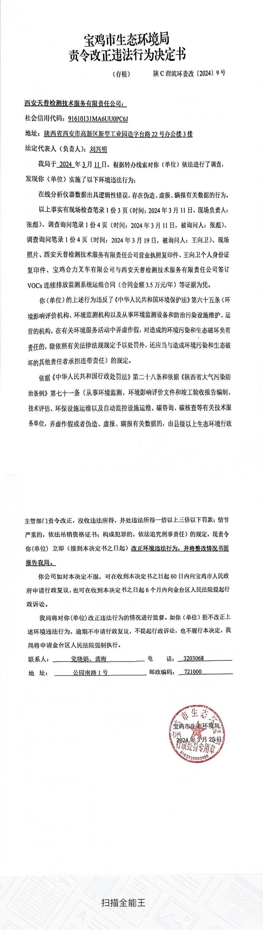 十大网赌平台排行榜责令改正违法行为决定书(陕C渭滨环责改〔2024〕9号)