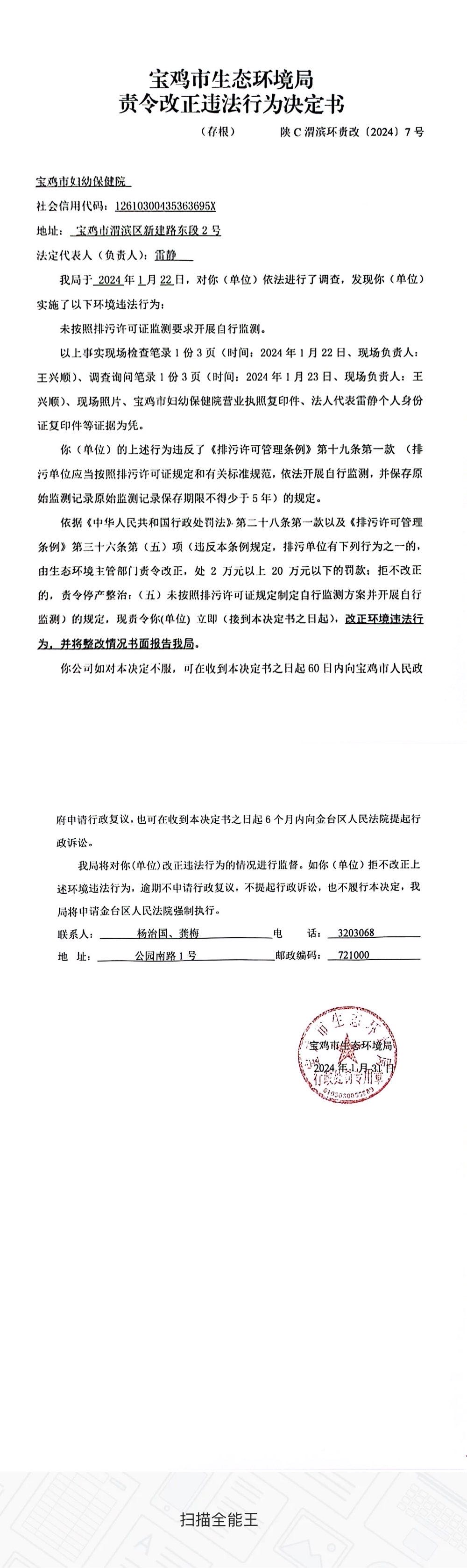十大网赌平台排行榜责令改正违法行为决定书(陕C渭滨环责改〔2024〕7号)