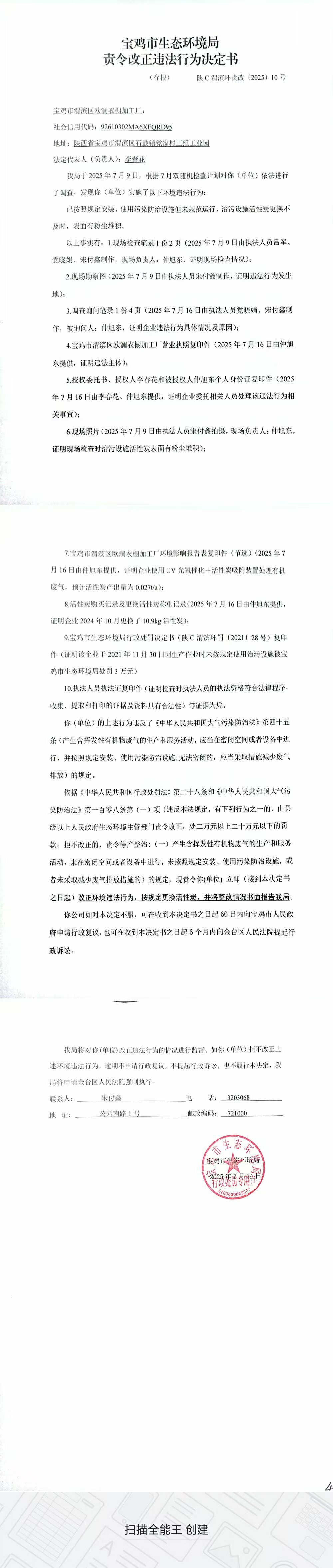 十大网赌平台排行榜责令改正违法行为决定书(陕C渭滨环责改〔2025〕10号)