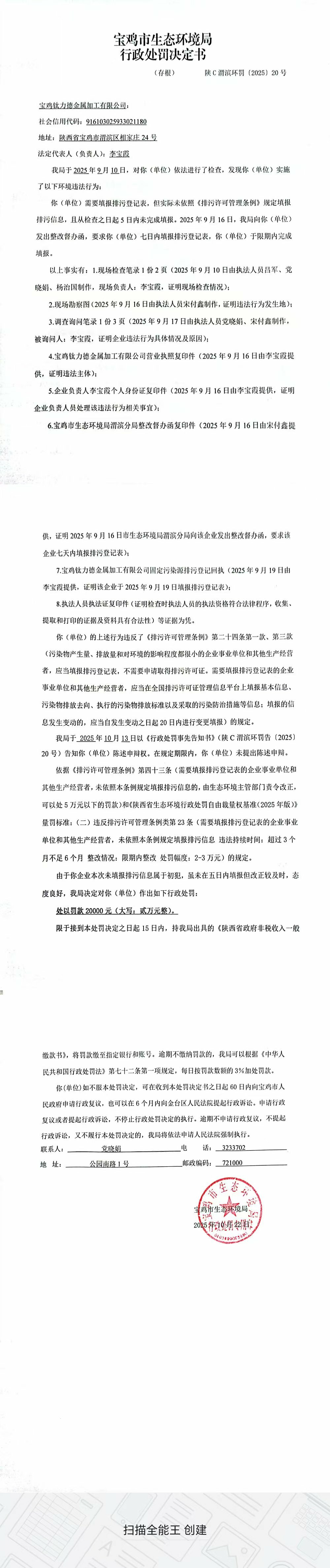 十大网赌平台排行榜行政处罚决定书(陕C渭滨环罚〔2025〕20号)