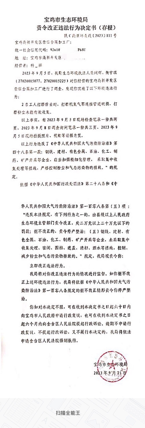 网赌平台责令改正违法行为决定书(陕C高新环责改〔2023〕111号)