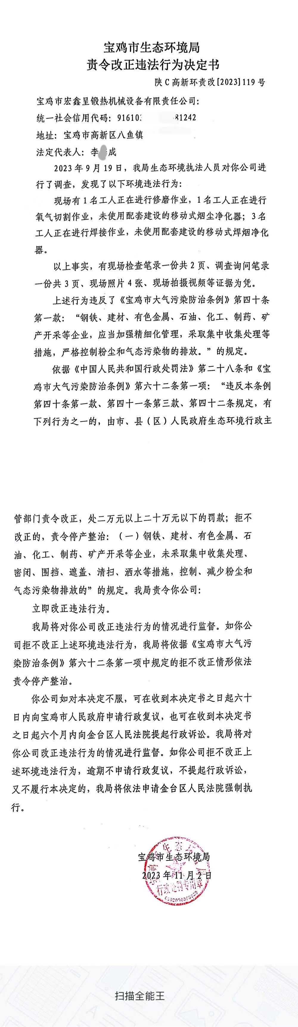 十大网赌平台排行榜责令改正违法行为决定书(陕C高新环责改〔2023〕119号)