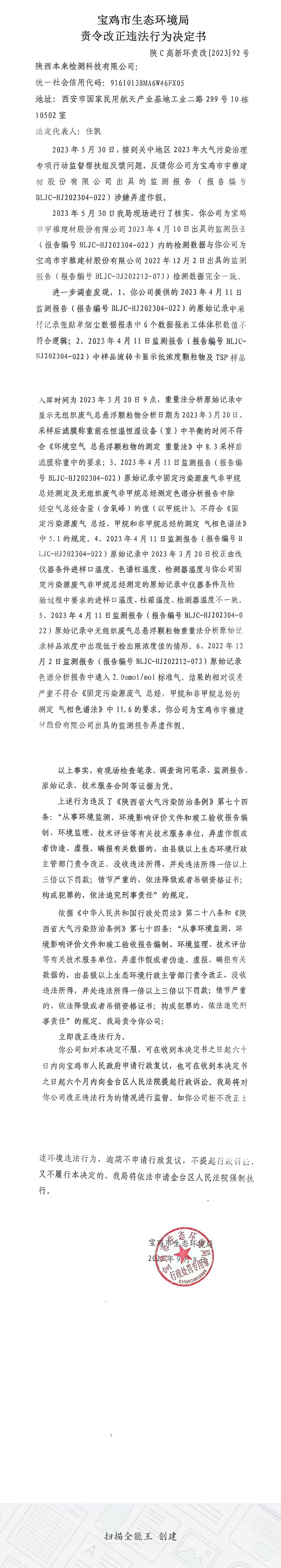 十大网赌平台排行榜责令改正违法行为决定书(陕C高新环责改[2023]92号)