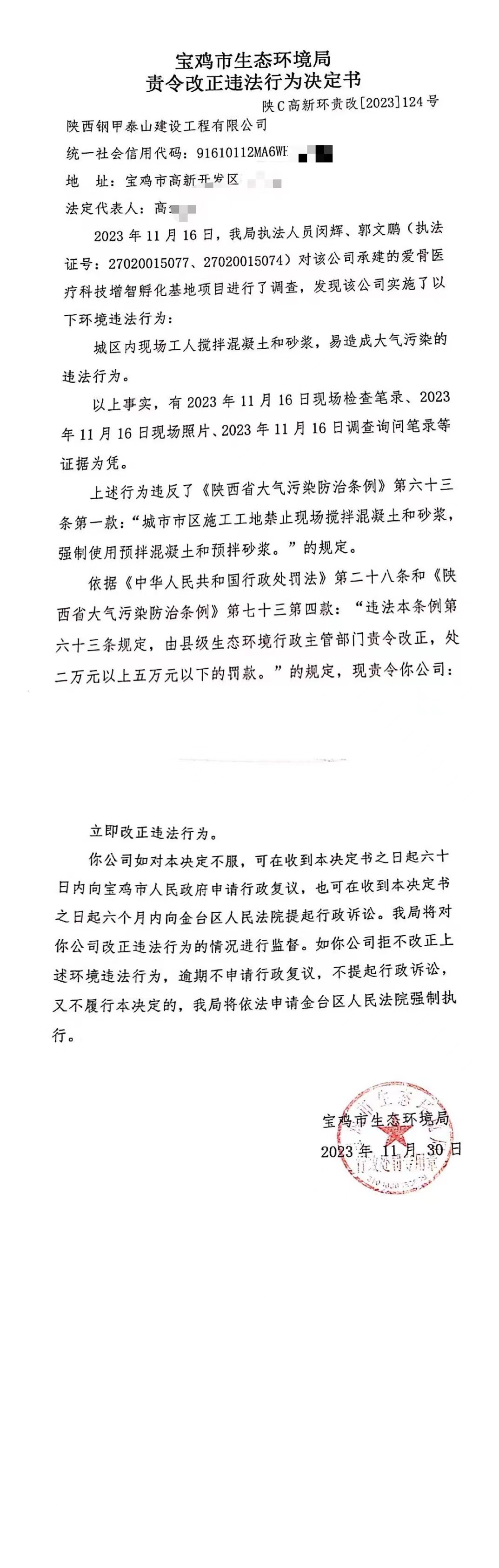 网赌平台责令改正违法行为决定书(陕C高新环责改〔2023〕124号)