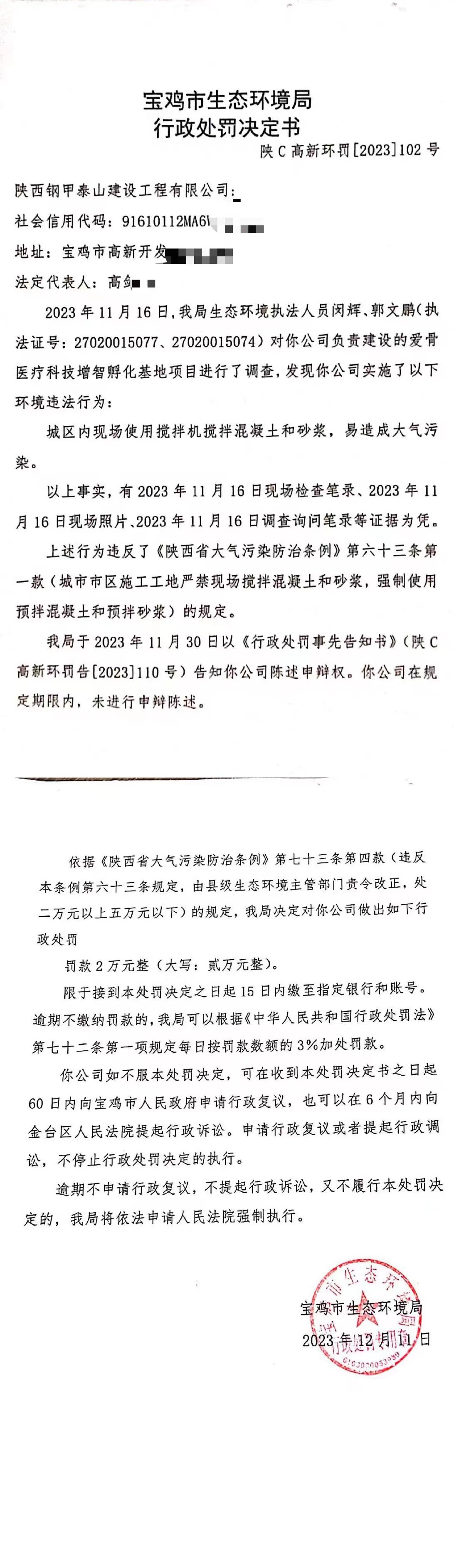 网赌平台行政处罚决定书(陕C高新环罚[2023]102号)