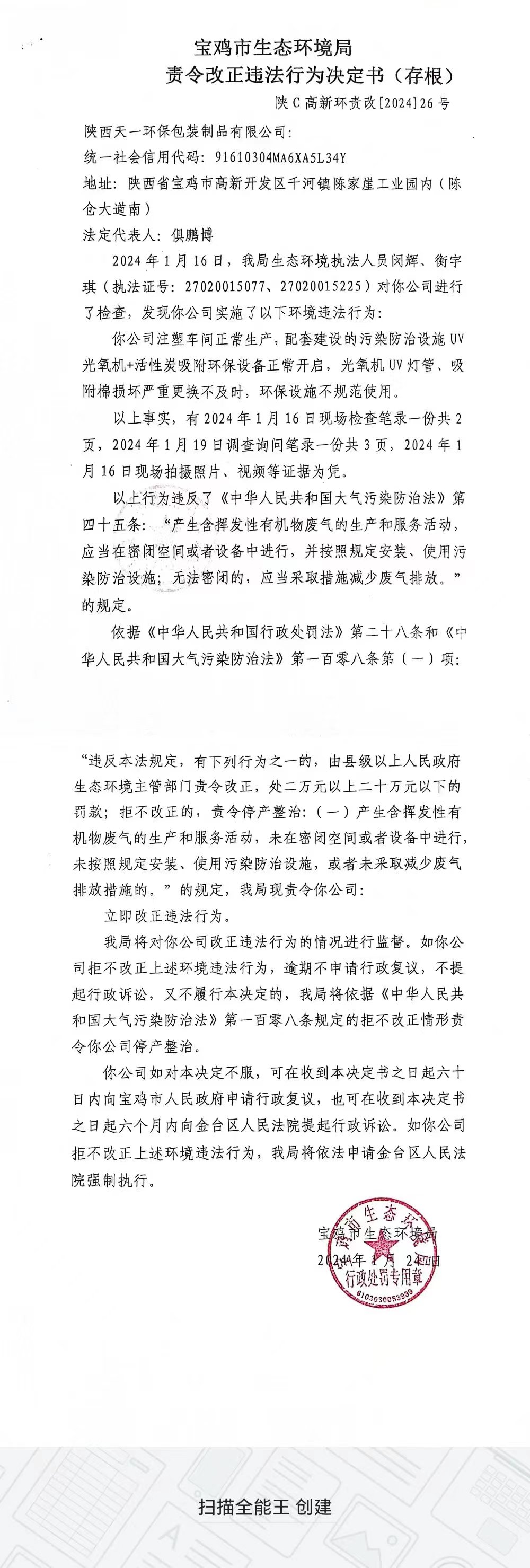十大网赌平台排行榜责令改正违法行为决定书(陕C高新环责改〔2024〕26号)