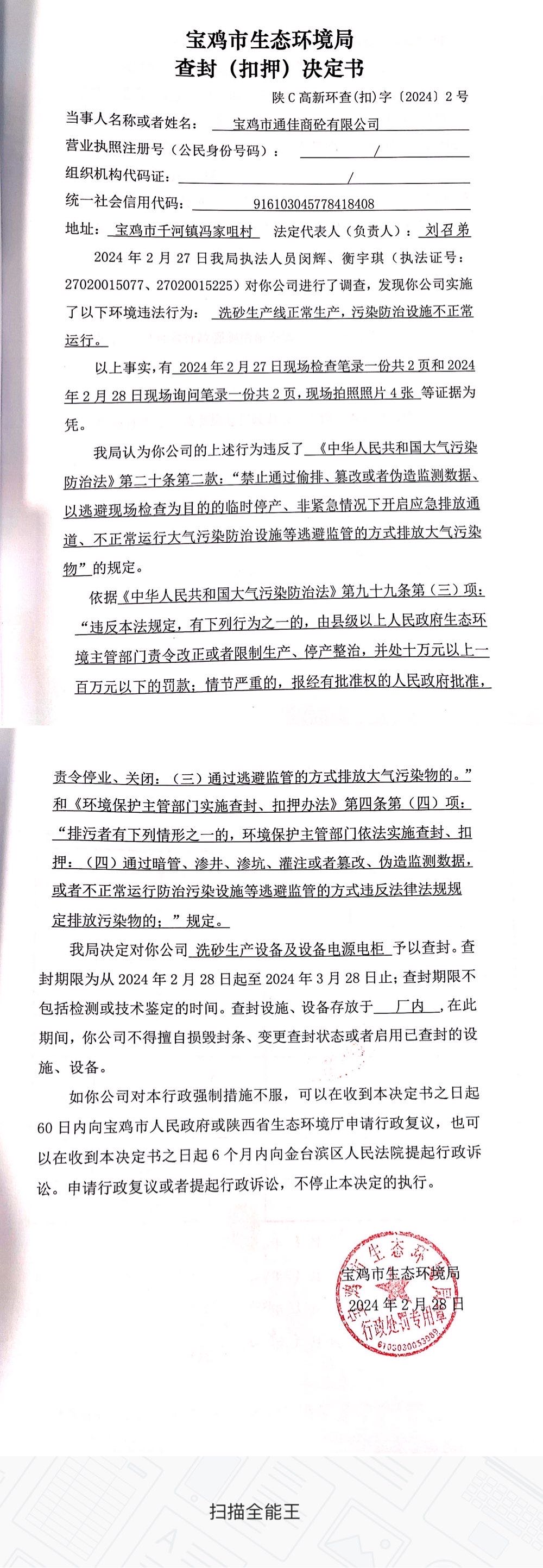 网赌平台查封(扣押)决定书(陕C高新环查(扣)字[2024]2号)