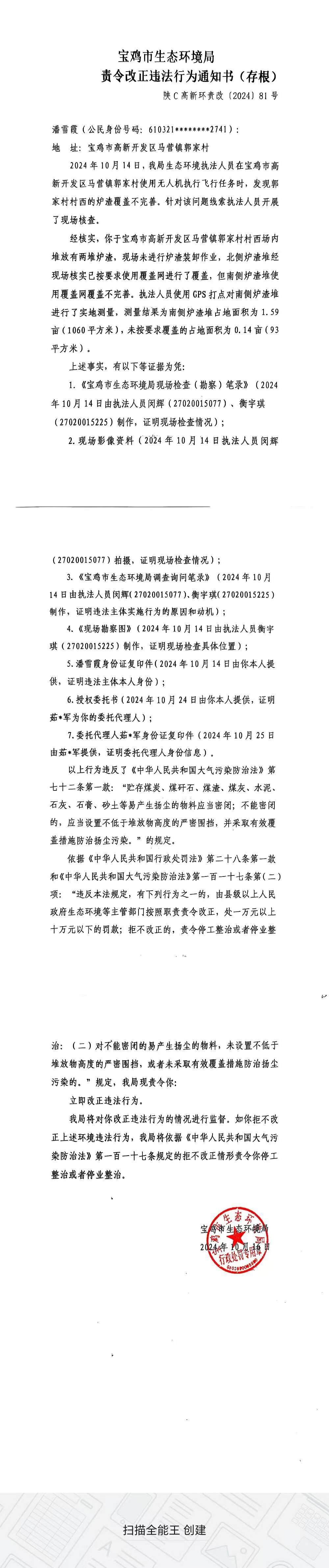 十大网赌平台排行榜责令改正违法行为决定书(陕C高新环责改〔2024〕81号)